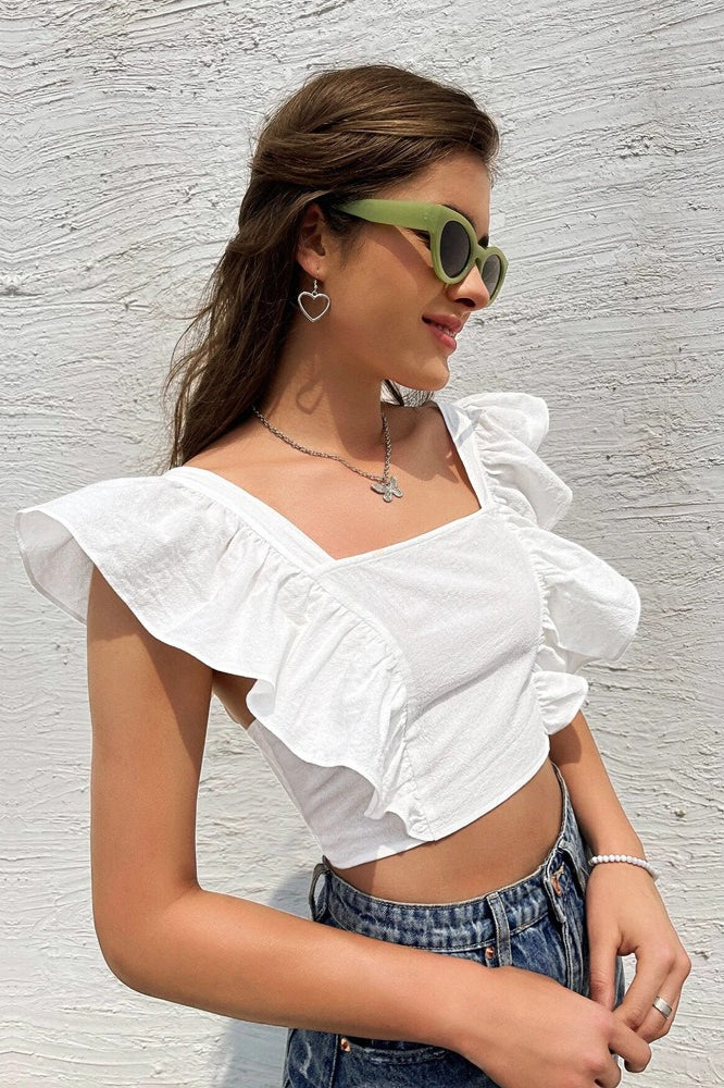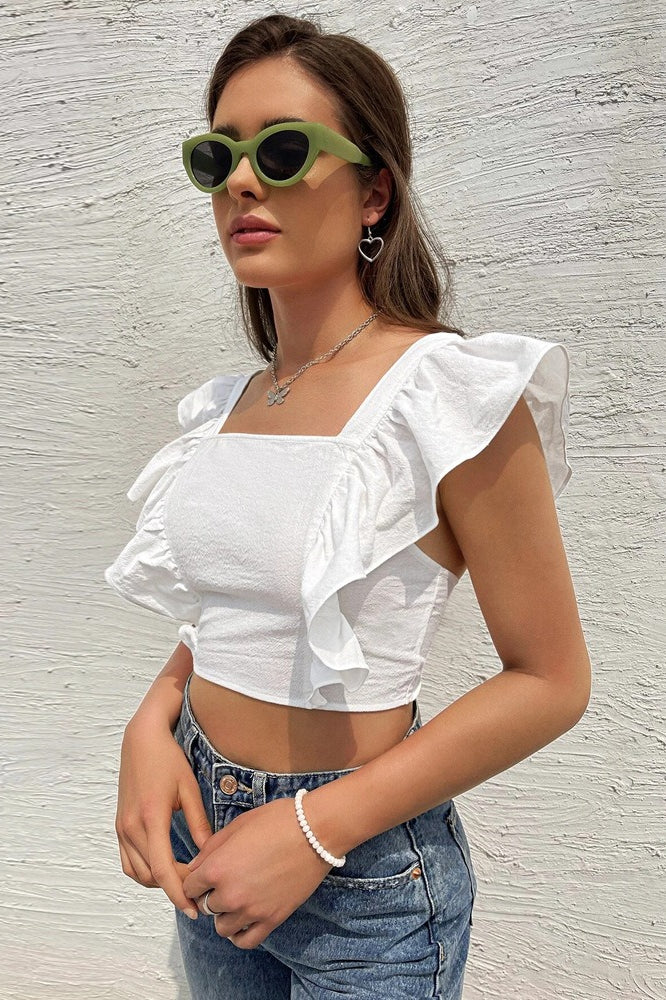 • Length: Short • Neckline: Square Neck • Sleeve Type: Flounce Sleeve • Sleeve Length: Short Sleeve • Details: Backless • Composition: Polyester