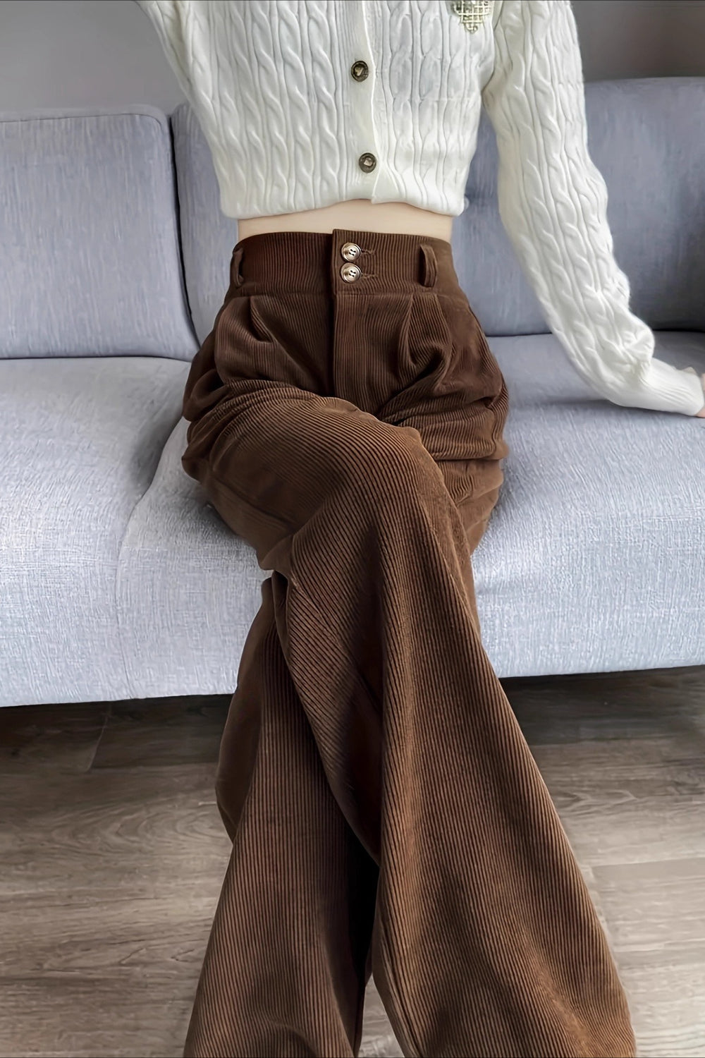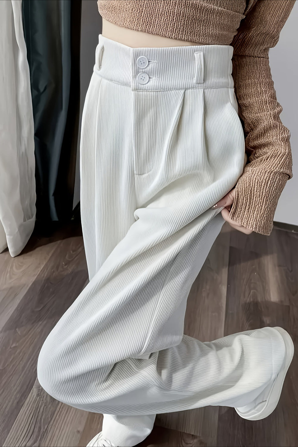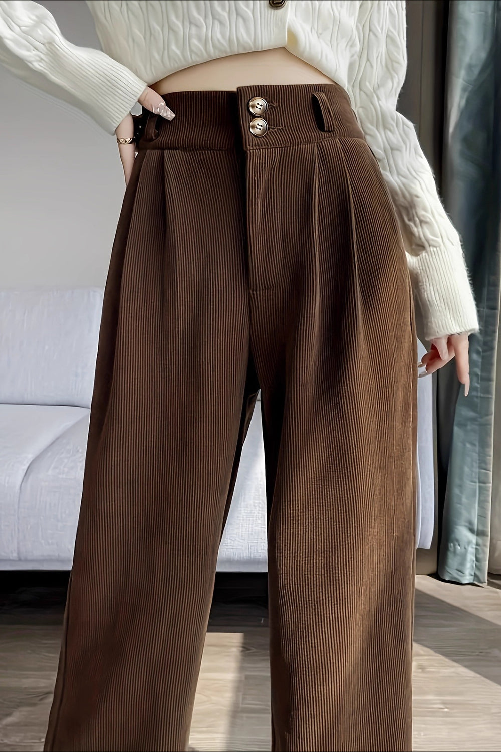 • Waist Type: High Waist • Clothing Type: Straight Pants • Composition: Polyester • Details: Solid Color
