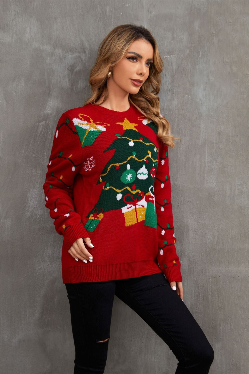 Christmas Cozy Color Block Xmas Tree Print Sweater
