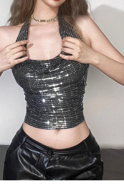 • Fit: Slim Fit • Composition: Polyester, Spandex • Details: Sequins, Backless, Cropped