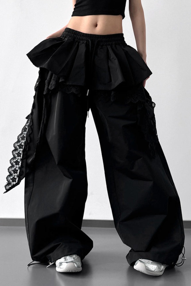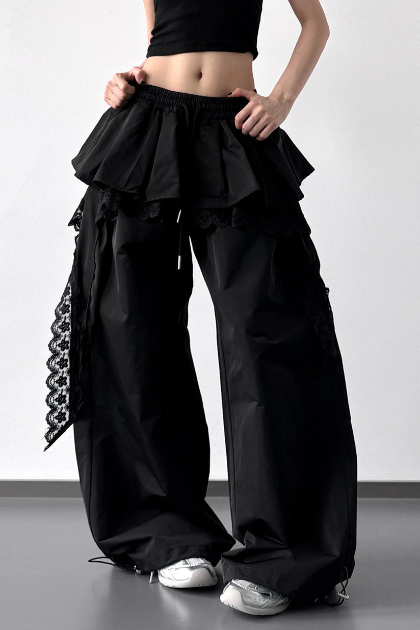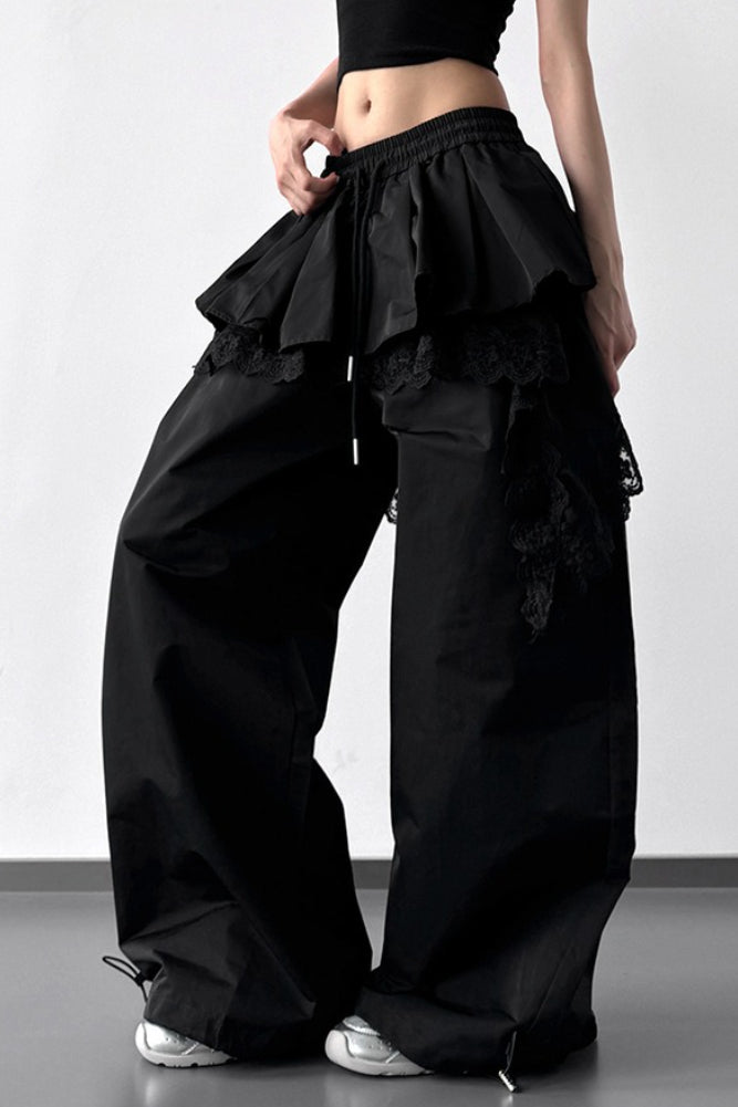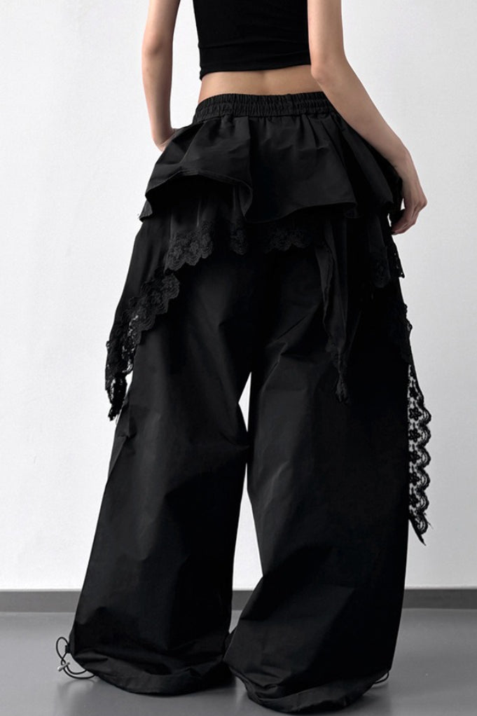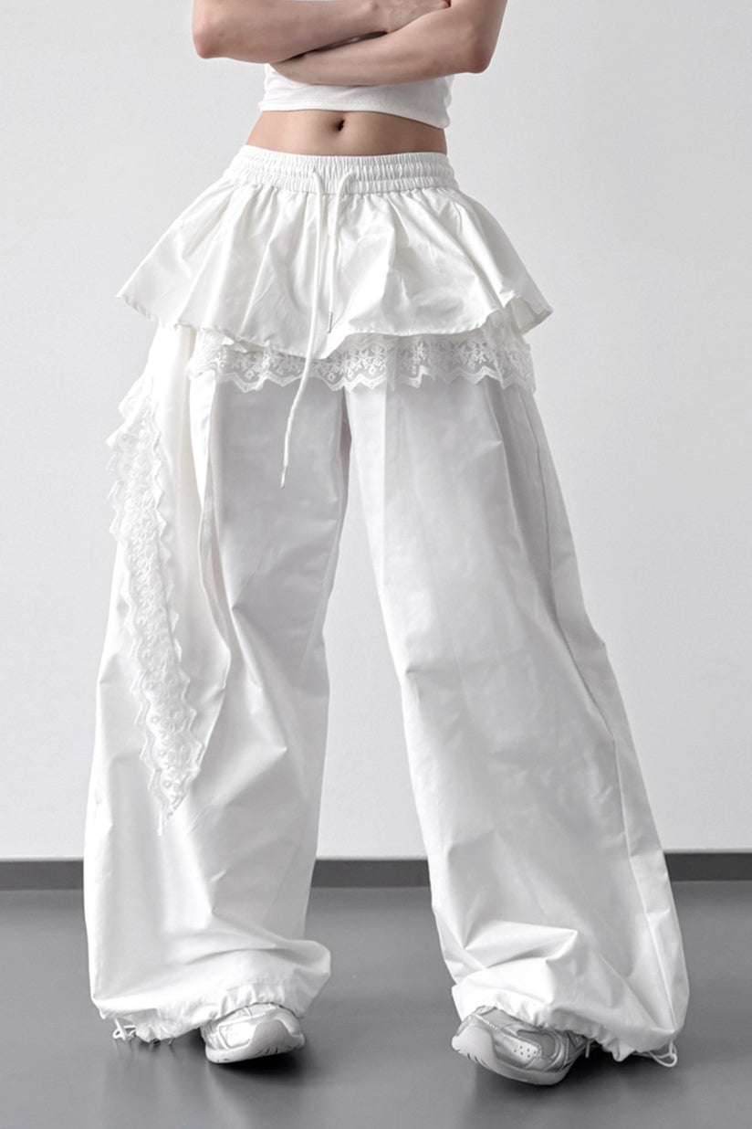 Lace Skirt Hem Trim Wide Leg Casual Pants
